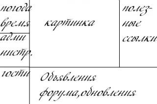 <table width="100%" border="1"> <tbody align="center"> <tr> <td colspan="3">Название форума</td></tr> <tr> <td width="25%">Админы</td> <td rowspan="2"><img src="Адрес картинки" /></td> <td width="25%">Модеры</td></tr> <tr> <td>Игра</td> <td>Календарь</td></tr> <tr> <td colspan="3">Объявление</td></tr> </tbody> </table>