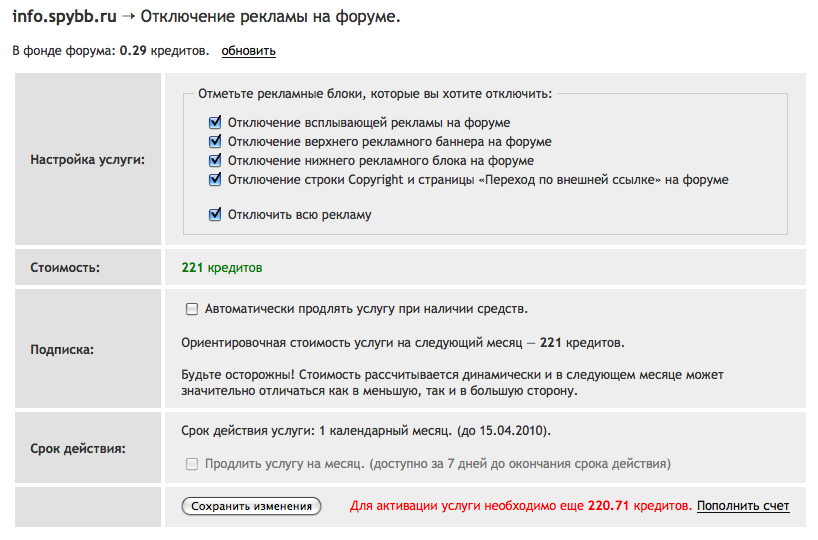 Отключение всплывающей рекламы: 30 кредитов.
