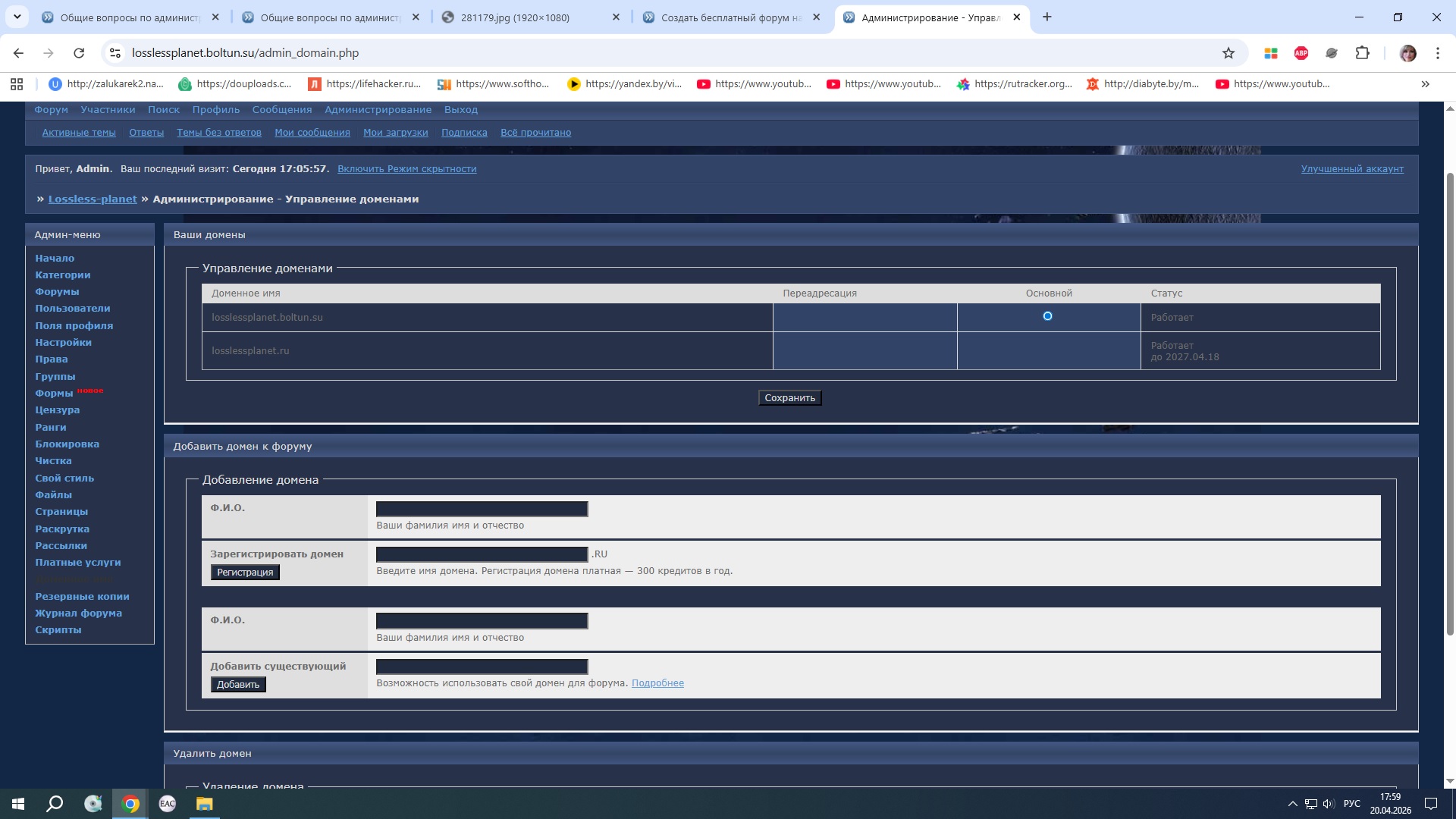 В этой теме администраторы форумов могут задавать различные вопросы по администрированию форума, которые не были затронуты в справочном разделе, а также делиться опытом управления форумом с другими администраторами, отвечая на их вопросы. Это могут быть вопросы, например, "в какие поля следует вставлять код конкретного скрипта", "как заблокировать подсеть пользователя на форуме", "как зарегистрировать домен и прикрепить его к форуму" и прочие подобные. В этой же теме вы также можете задавать вопросы по функциональности некоторых скриптов.
