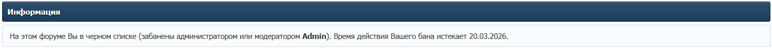 В поле Сообщение укажите текст, который будет показан заблокированному пользователю при заходе на форум. Если оставить это поле пустым, то будет показан стандартный текст блокировки: