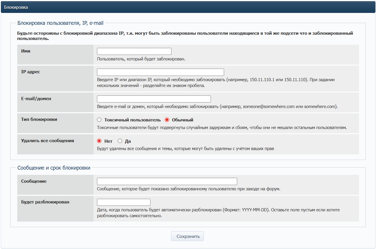 Внимание! Будьте осторожны с блокировкой диапазона IP, поскольку могут быть заблокированы пользователи, находящиеся в той же подсети, что и заблокированный пользователь. Хоть профиль главного администратора заблокировать невозможно, но если его IP окажется в диапазоне заблокированных, то он не сможет попасть на форум до смены IP (или сети) на другой.