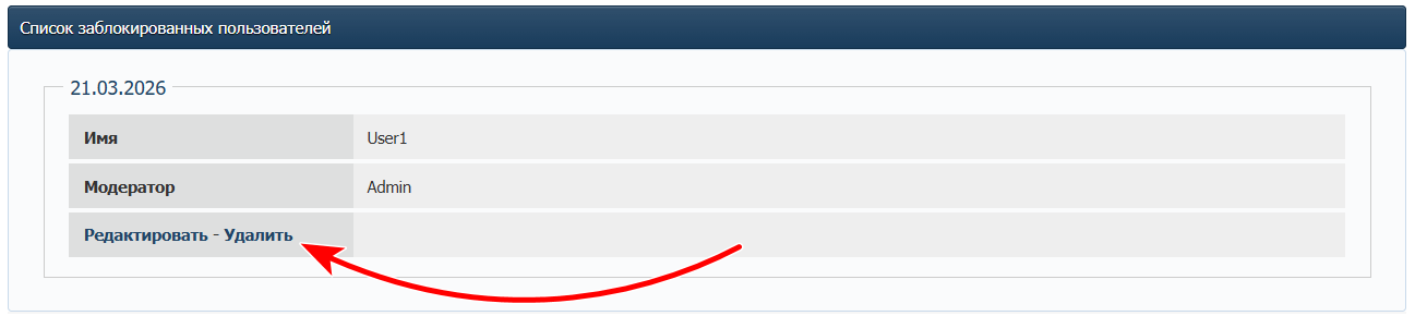 Для разблокировки пользователя достаточно удалить запись с блокировкой на странице Администрирование - Блокировка, нажав ссылку Удалить.