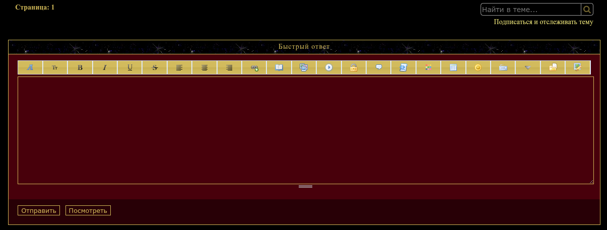 Раз обещала, значит - выложу. Но получается, что с недоделками. Значки форматирования на панели инструментов быстрого ответа видны плохо. Кстати, это проблема не только этого стиля, а всех тёмных стилей на Майбб - на всех тёмных фонах эти значки выглядят именно так. Ну, можно будет считать это проверкой зрения, как в кабинете окулиста, если юзеры различают эти значки - значит, у них просто отличное зрение! А если нет, то ... зрение у них упало. Стебусь.