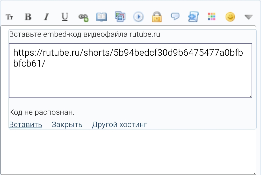 Я переехал с YouTube, в связи с чем (увидел) просьба добавить в кнопке выбора видеохостинга Вставьте embed-код видеофайла rutube.ru возможность вставки ссылки, как это реализовано для YouTube, а то